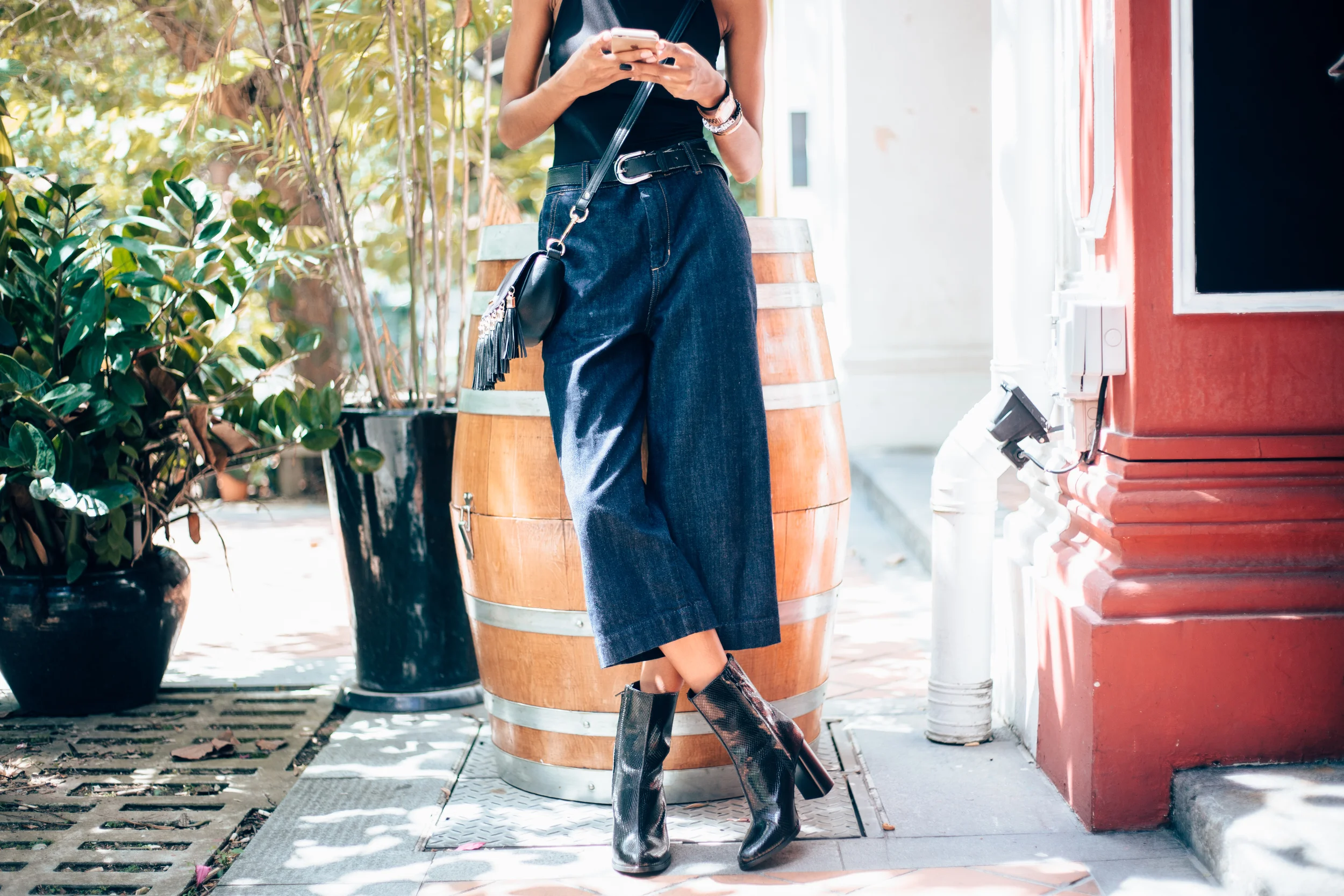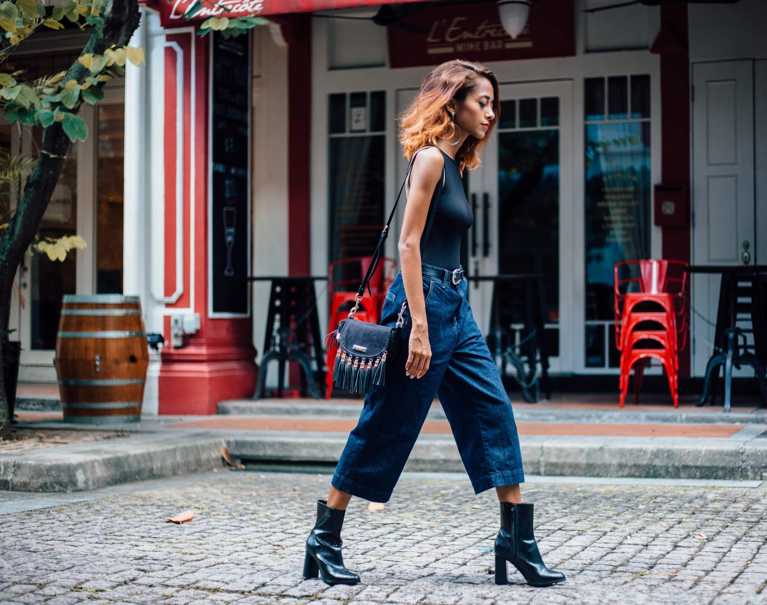 BODYSUIT, FROM TOPSHOP VIA ZALORA SG, DENIM CULOTTES VIA ZARA, EARRINGS VIA POMELO, TASSEL CROSS BODY FROM RIVER ISLAND VIA ZALORA SG, HEELED BOOTS FROM MANGO VIA ZALORA SG.